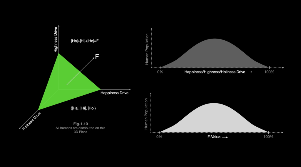Imagine plotting these drives on a graph: the distribution of our happiness drive among the global population would likely resemble a bell curve, ranging from 0% to 100%. The same distribution applies to the drives for highness and holiness. The sum total of these drives for any individual adds up to a constant—F (Fulfillment Constant).